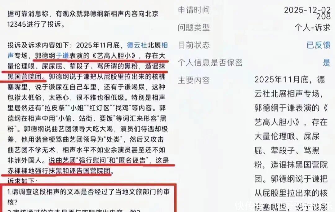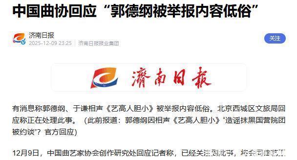 02德云社演出时低俗桥段太多,这已经是公认的事情!但抹黑国家主流院团是同行们无法忍受的,这也是西城文旅约谈郭德纲的主要原因!既然抹黑的是国家主流院团,自然,中国曲协就要站出来回应!12月9日,也就是郭德纲被约谈后的第五天,中国曲艺家协会创作研究处回应记者称:已经关注到此事,将会同曲艺工作者共同维护好风清气正的行业状态!